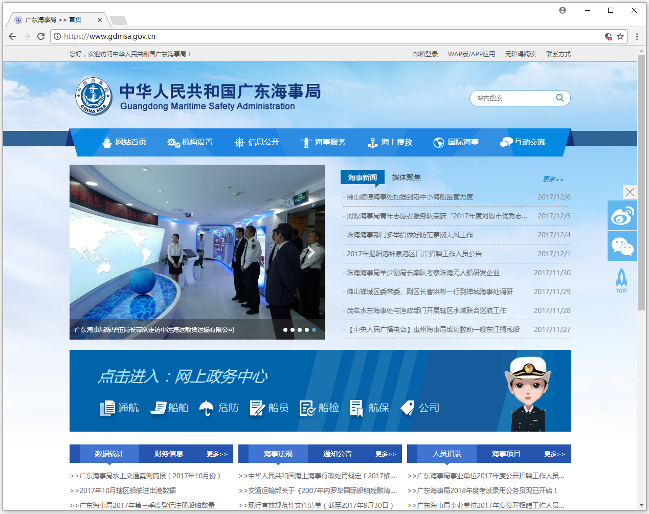 广东海事局以及下属各地市分支局各直属单位对外信息门户平台,负责各局各部门信息的对外发布、信息公开、法律法规、文档资料、海事服务、数据查询、互动交流、投诉建议等综合性功能。同时具备电脑版和手机版。