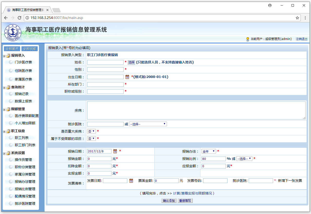 针对广州局职工医疗报销的具体情况,定制开发报销管理功能,实现报销申请、部门审批、数据统计、清单打印、报销规则控制、流程管理等。并实现与该局其他内部系统进行对接,人员和数据的互通、统一登录验证等需求。