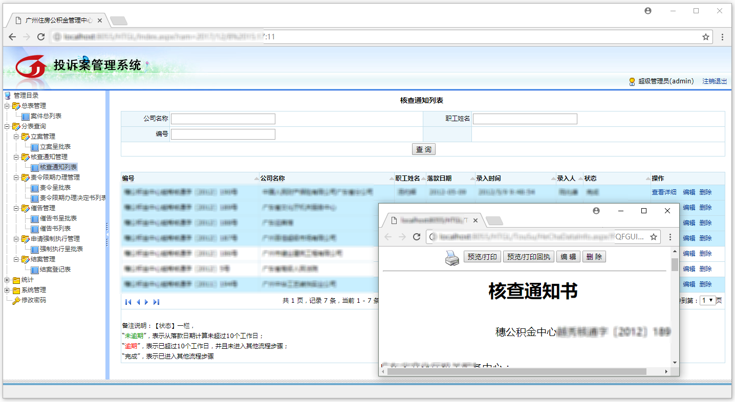 围绕公积金投诉、督缴两大内务流程,开发相关管理功能,实现对业务资料登记、流程审批、数据汇总、清单套打、时效事项提醒等。