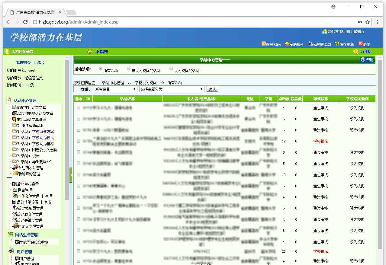 根据学校部所开展各高校团支部活动文件,搭建主题活动平台,实现各高校团支部帐号管理、活动申报、各高校各地市审批、各种奖项的评选、活动内容展示、各类数据汇总、奖项排名、省学校部数据管理等。具备电脑版、手机版,满足多终端使用。